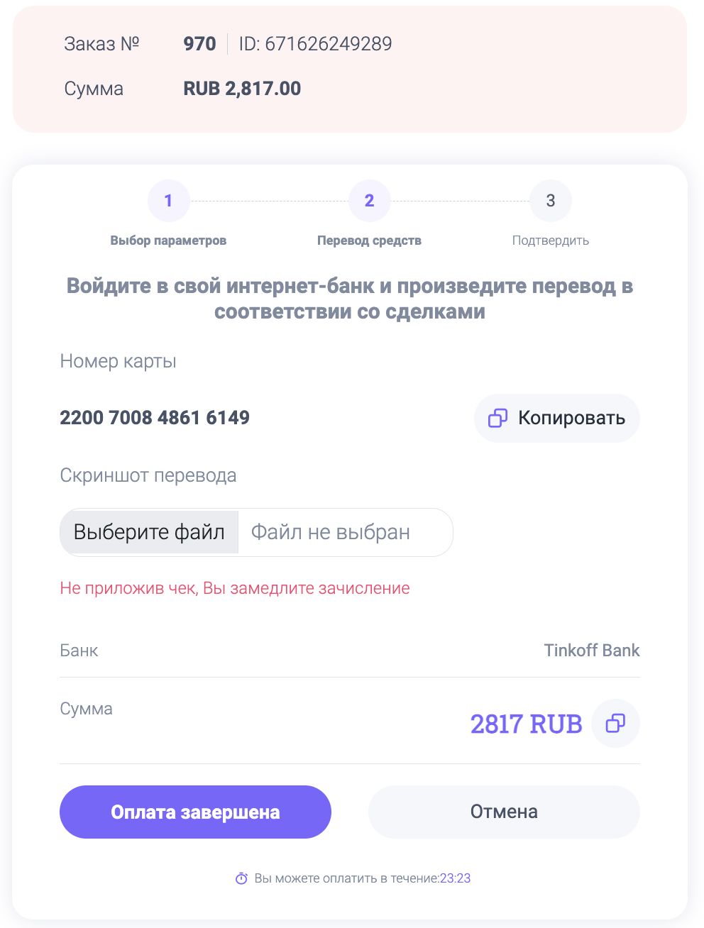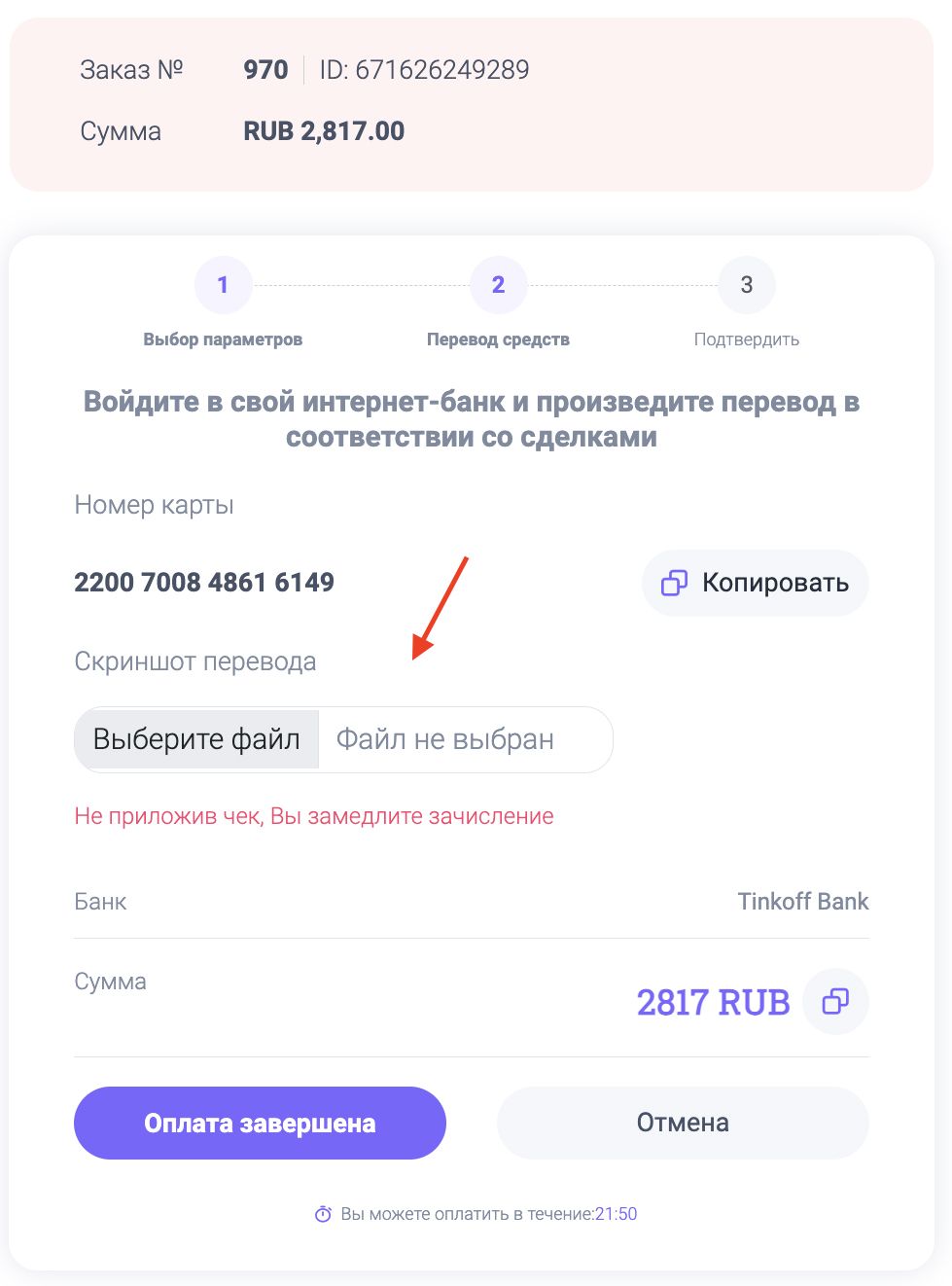 Нажимаем кнопку «Оплата завершена», если перевод был успешно отправлен и чек загружен в поле.